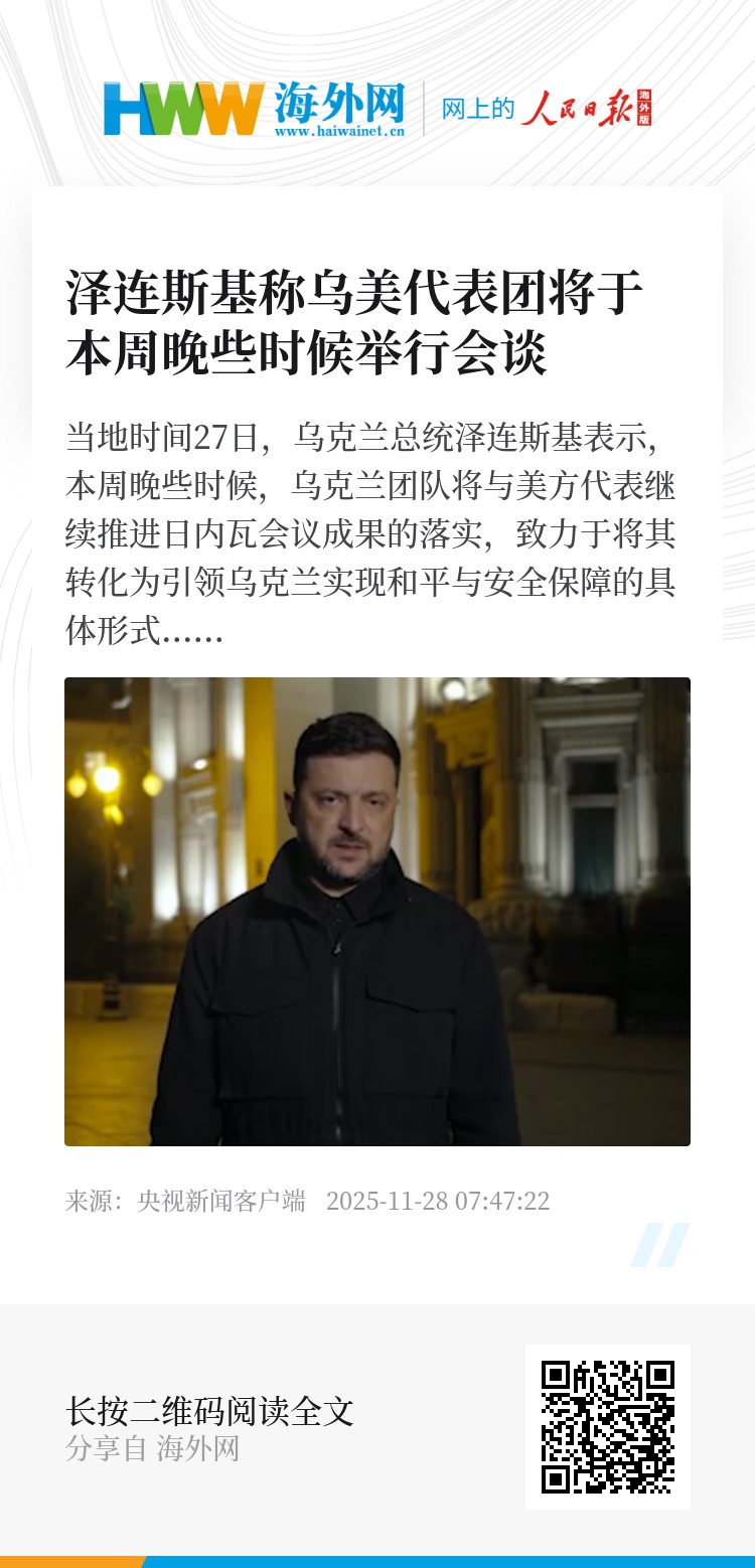 当地时间27日,乌克兰总统泽连斯基表示,本周晚些时候,乌克兰团队将与美方代表继续推进日内瓦会议成果的落实,致力于将其转化为引领乌克兰实现和平与安全保障的具体形式。双方代表团将举行会谈,乌方代表团会做好充分准备,致力于开展务实工作。