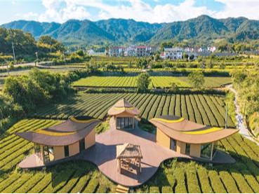 安徽省岳西县琥珀村,民宿与民居、茶园、青山等相映成景,构成一幅和美乡村的生态画卷。王 江摄(人民视觉)