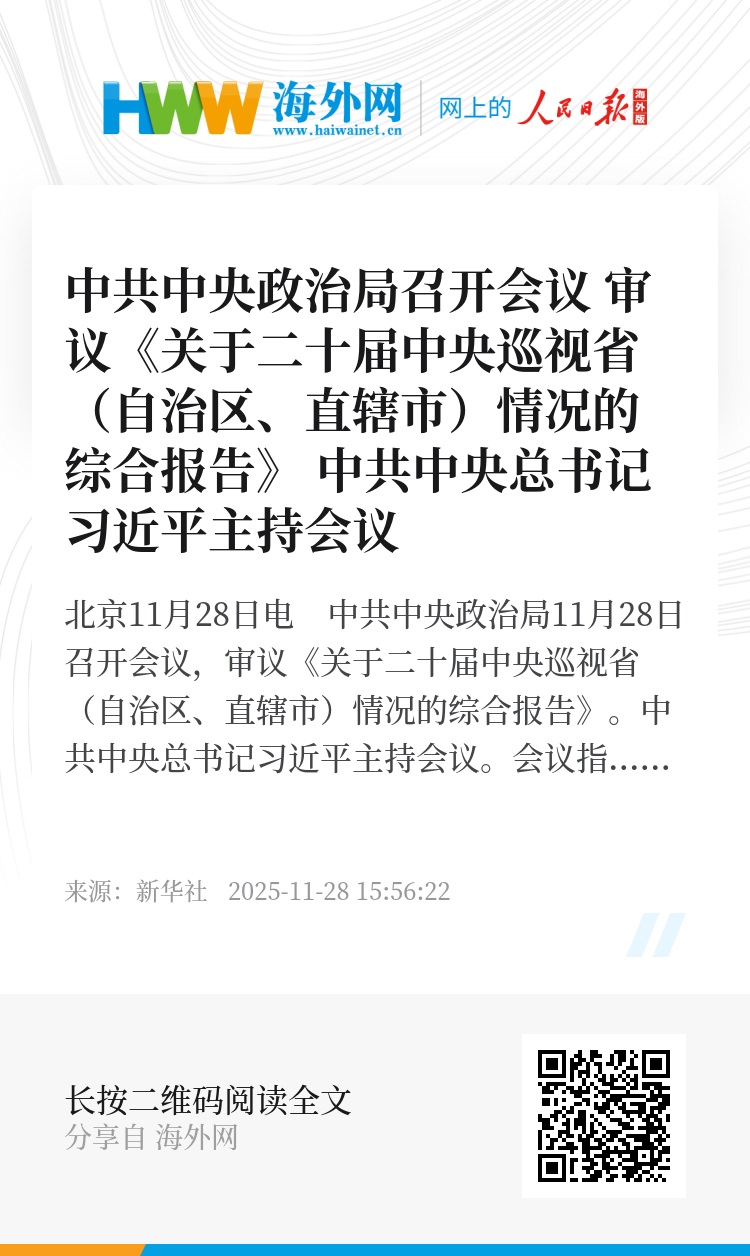 新华社北京11月28日电 中共中央政治局11月28日召开会议,审议《关于二十届中央巡视省(自治区、直辖市)情况的综合报告》。中共中央总书记习近平主持会议。