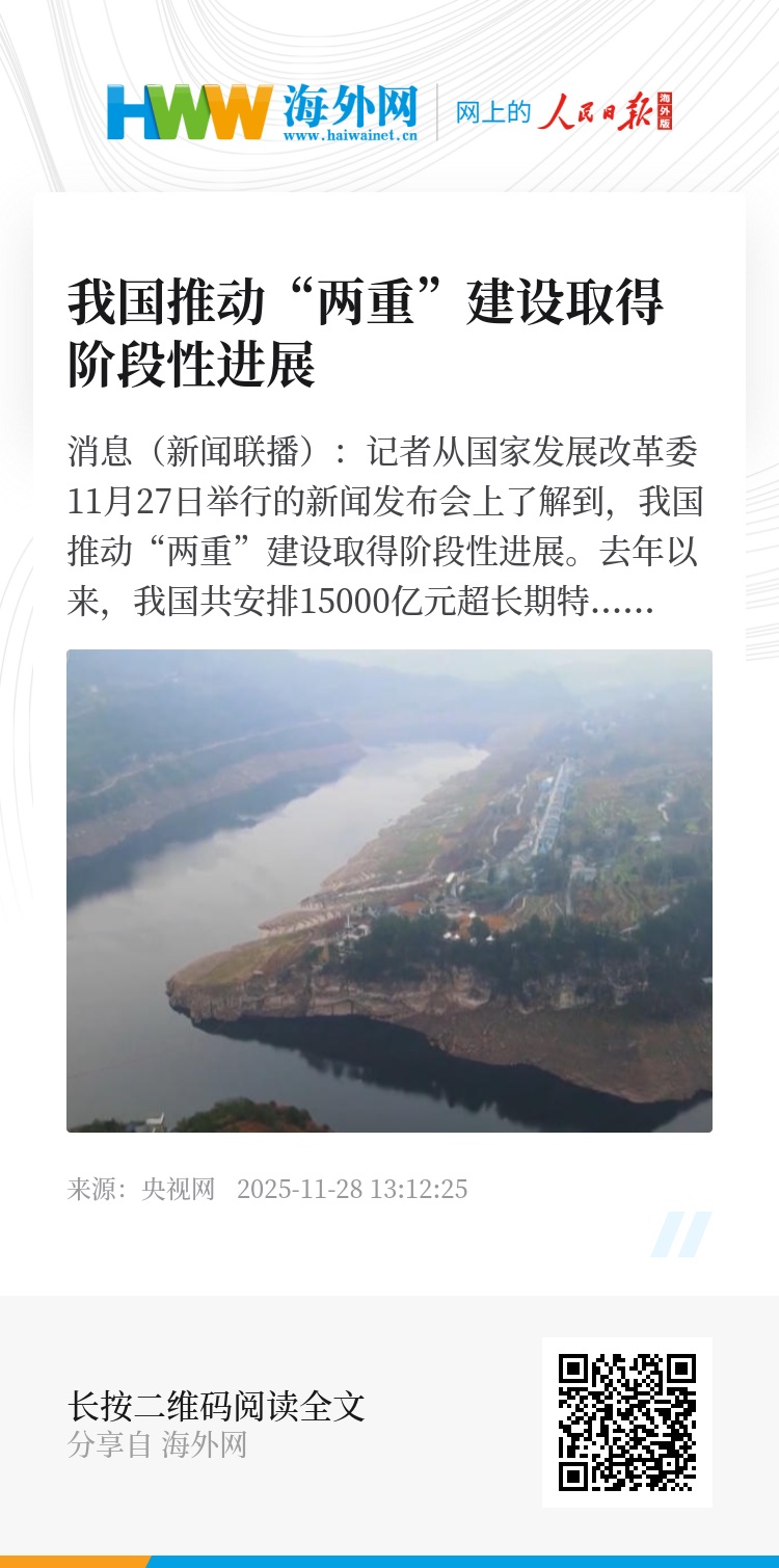 央视网消息(新闻联播):记者从国家发展改革委11月27日举行的新闻发布会上了解到,我国推动“两重”建设取得阶段性进展。