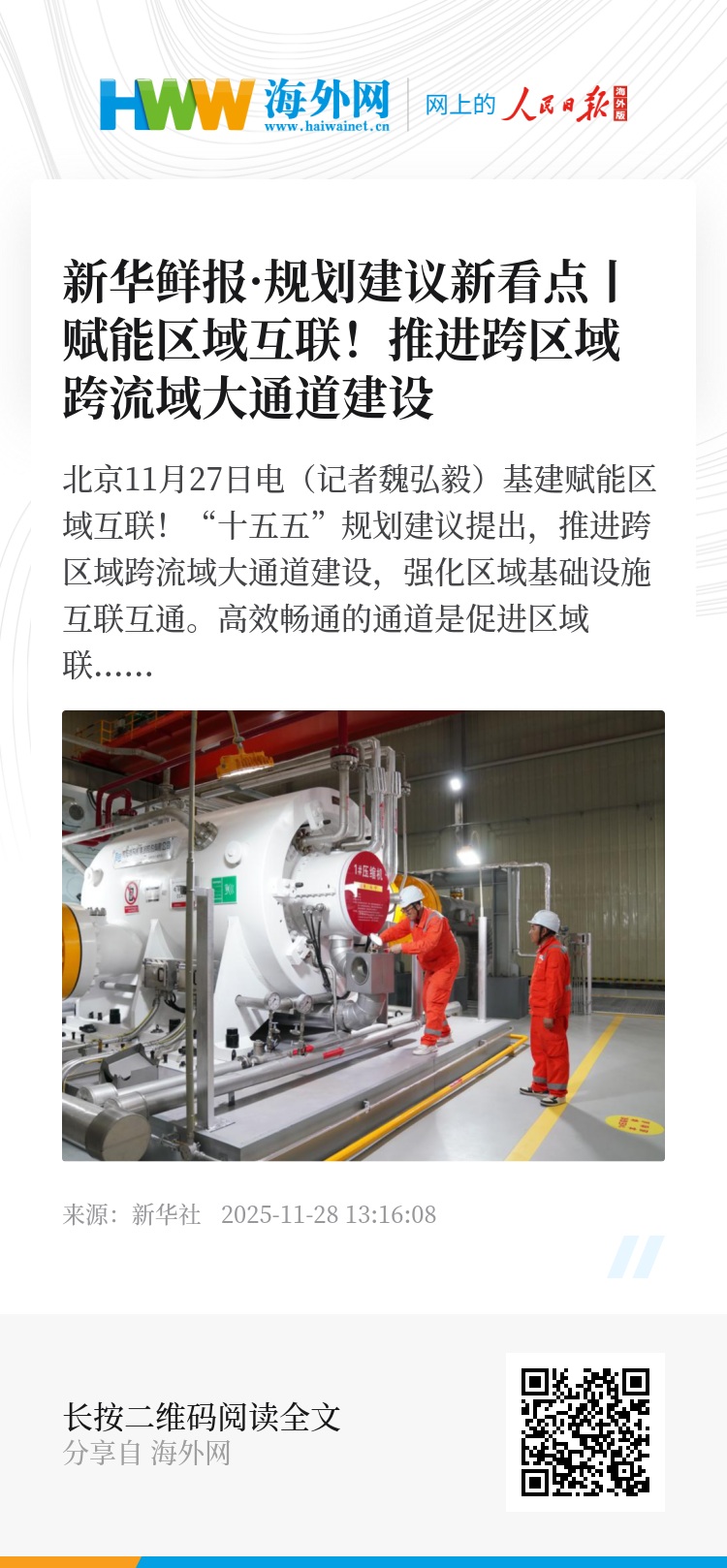 新华社北京11月27日电(记者魏弘毅)基建赋能区域互联!“十五五”规划建议提出,推进跨区域跨流域大通道建设,强化区域基础设施互联互通。