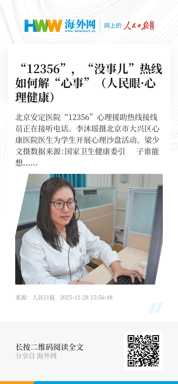 北京“12356”热线开通以来,跨省服务外地来电占比过半。“热线号码全国统一,让医疗资源相对薄弱区域的人群也能共享北京的优质资源。”北京安定医院心理治疗师、接线员苏虹说,一些地方相对偏远,但热线把专业心理医疗服务带到了那里,这件事很有意义。