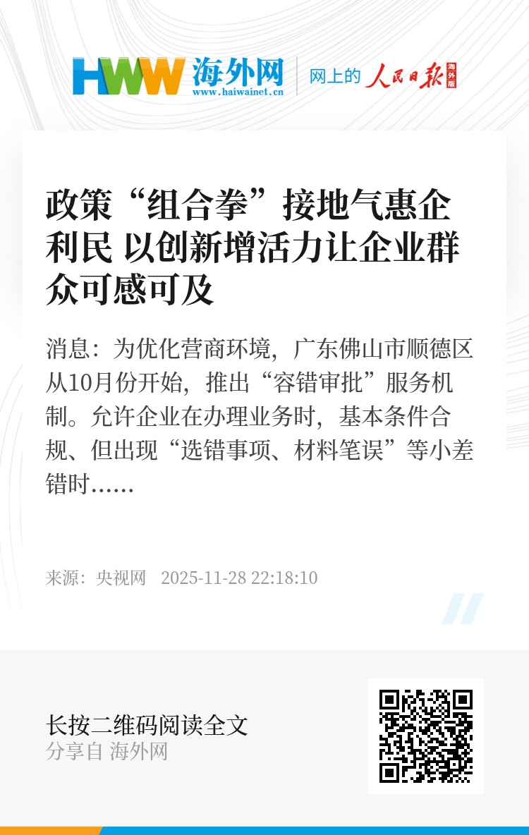 央视网消息:为优化营商环境,广东佛山市顺德区从10月份开始,推出“容错审批”服务机制。允许企业在办理业务时,基本条件合规、但出现“选错事项、材料笔误”等小差错时,无需重新准备,补正材料即可出结果。现在,这一规定已经执行一个月情况如何?