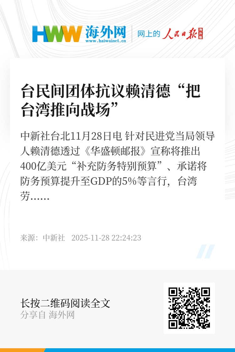 中新社台北11月28日电 针对民进党当局领导人赖清德透过《华盛顿邮报》宣称将推出400亿美元“补充防务特别预算”、承诺将防务预算提升至GDP的5%等言行,台湾劳动党、台湾社会共好论坛筹备会等民间团体28日在台立法机构门口发起抗议活动,斥责赖清德违背一中原则,把台湾推向战场。