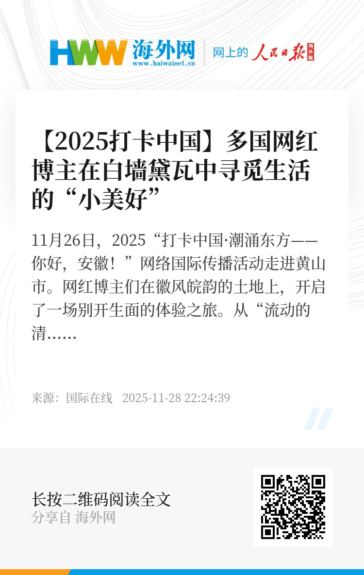 11月26日,2025“打卡中国·潮涌东方——你好,安徽!”网络国际传播活动走进黄山市。网红博主们在徽风皖韵的土地上,开启了一场别开生面的体验之旅。从“流动的清明上河图”到多元融合的旅行新场景,再到“画里乡村”,他们在白墙黛瓦中感受着生活的诗意与美好。