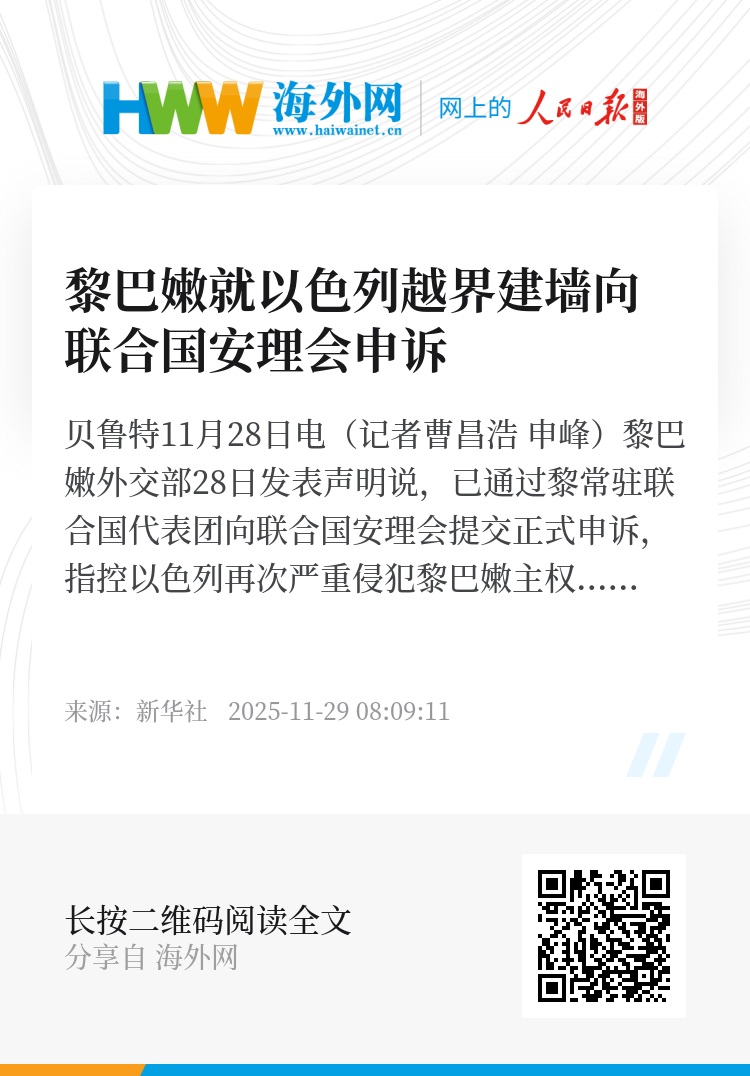 新华社贝鲁特11月28日电(记者曹昌浩 申峰)黎巴嫩外交部28日发表声明说,已通过黎常驻联合国代表团向联合国安理会提交正式申诉,指控以色列再次严重侵犯黎巴嫩主权。