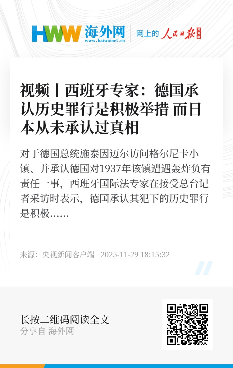 对于德国总统施泰因迈尔访问格尔尼卡小镇、并承认德国对1937年该镇遭遇轰炸负有责任一事,西班牙国际法专家在接受总台记者采访时表示,德国承认其犯下的历史罪行是积极的举措。