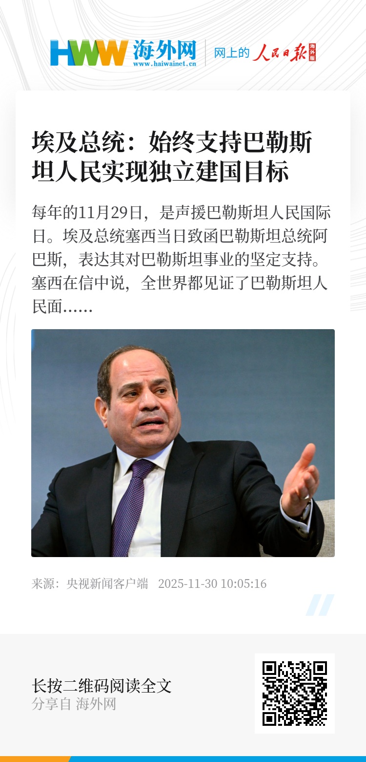 每年的11月29日,是声援巴勒斯坦人民国际日。埃及总统塞西当日致函巴勒斯坦总统阿巴斯,表达其对巴勒斯坦事业的坚定支持。