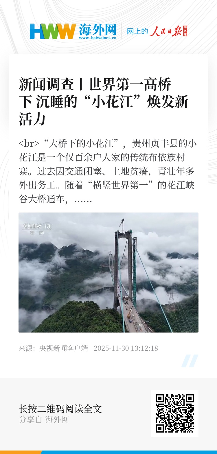 “大桥下的小花江”,贵州贞丰县的小花江是一个仅百余户人家的传统布依族村寨。过去因交通闭塞、土地贫瘠,青壮年多外出务工。随着“横竖世界第一”的花江峡谷大桥通车,游客与客商来了,村里的年轻人也回来了,沉睡的村庄正在被唤醒。桥旅融合为村寨带来发展机遇,也为大桥两岸黔西南州的经济发展带来机遇。