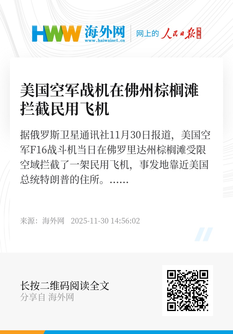 海外网11月30日电 据俄罗斯卫星通讯社、北美防空司令部社交媒体11月30日报道,美国空军F16战斗机当日在佛罗里达州棕榈滩受限空域拦截了一架民用飞机,事发地靠近美国总统特朗普的住所。