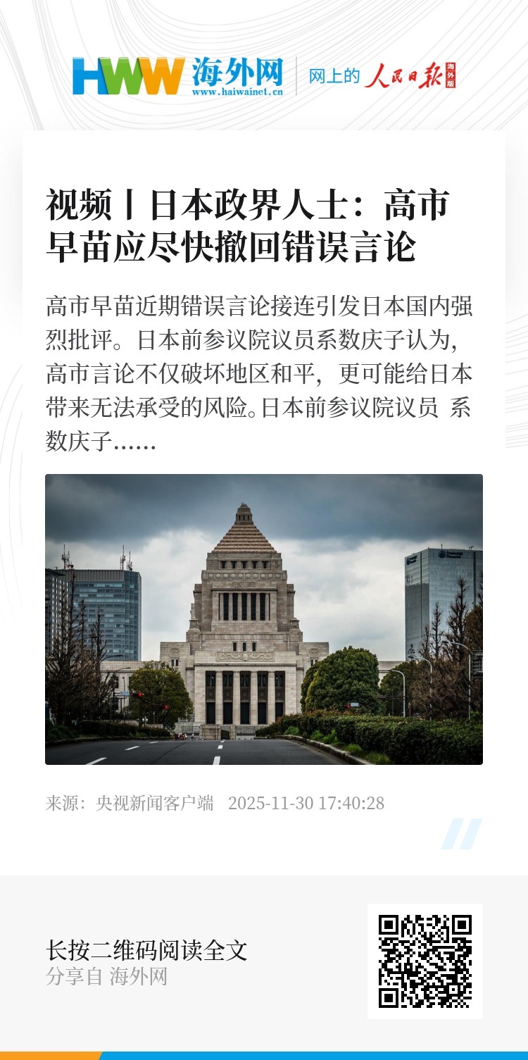 日本前参议院议员 系数庆子:在我们看来,完全不应该发表这样的言论,完全是干涉别国内政的发言。在我们看来,她(高市早苗)已经不具备首相的资格了,这种发言的后果就是这么严重,那样的言论是绝对不该说出口的。从这一点来说,我们希望高市能尽快撤回发言,越快越好。