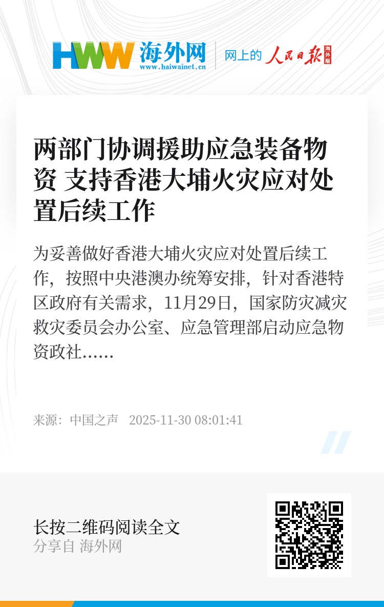 为妥善做好香港大埔火灾应对处置后续工作,按照中央港澳办统筹安排,针对香港特区政府有关需求,11月29日,国家防灾减灾救灾委员会办公室、应急管理部启动应急物资政社协同保障机制,向香港特区政府紧急提供便携式户外充电站、承重搬运机、鼓风机、呼吸器、护目镜、防护服、头灯、防水靴等应急装备物资,全力支持香港特区政府做好应对处置后续工作。