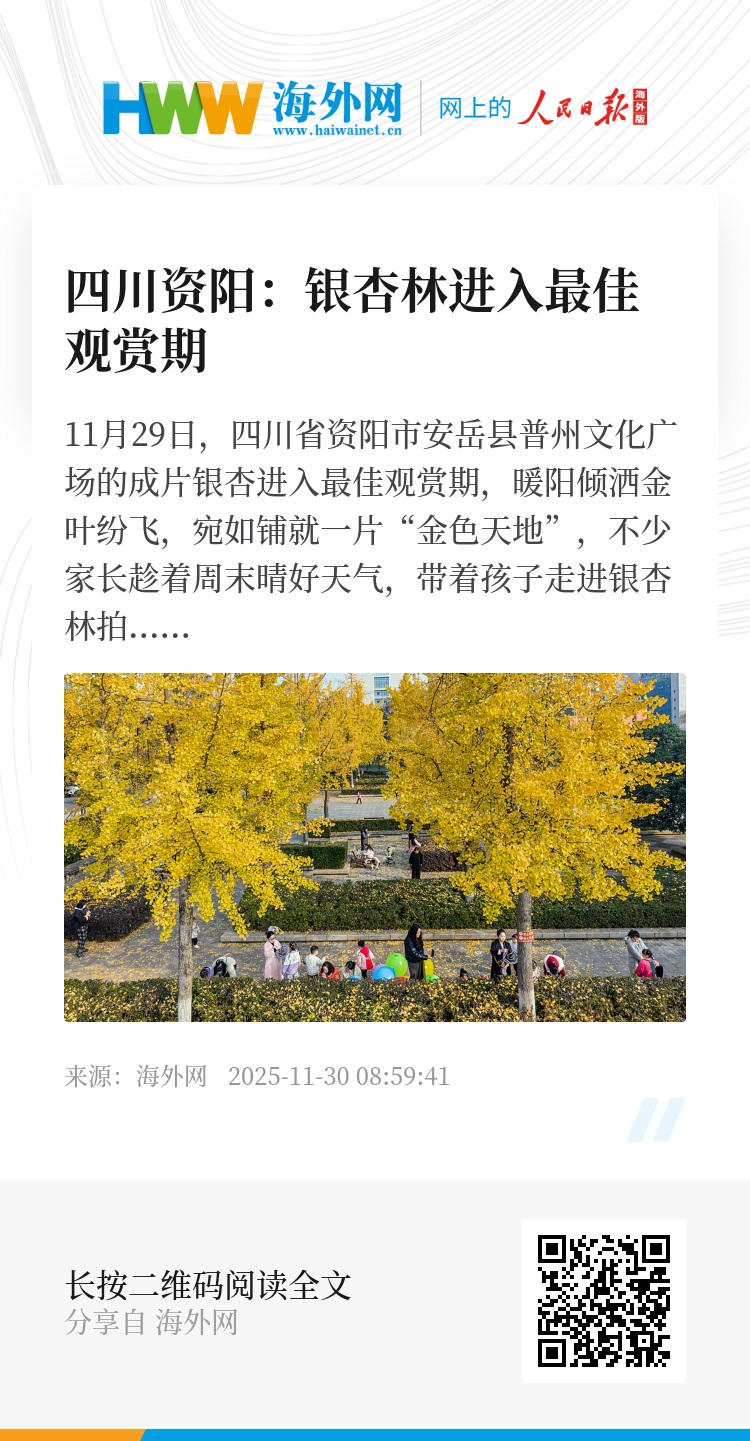 11月29日,四川省资阳市安岳县普州文化广场的成片银杏进入最佳观赏期,暖阳倾洒金叶纷飞,宛如铺就一片“金色天地”,不少家长趁着周末晴好天气,带着孩子走进银杏林拍照游玩。图源:视觉中国