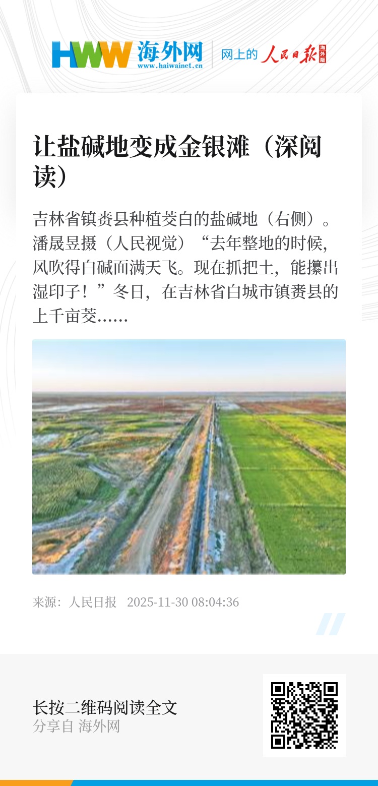 未来几年,镇赉县计划扩大茭白种植面积,并建设育苗越冬大棚、冷链物流基地和深加工车间,打造“培育—种植—加工—销售”的完整产业链。“我们要让盐碱地变成‘金银滩’,带动更多村民稳定增收。”镇赉县委书记常忠诚说。