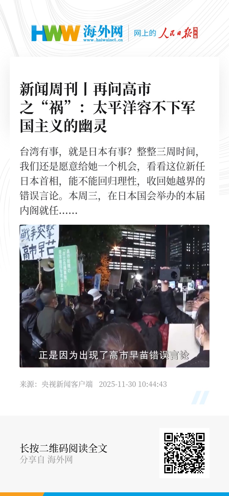 此外,尤其需要警惕的是,这场辩论谈及台湾问题时,高市早苗刻意回避了联合国文件和中日之间的政治共识,反而引用了一个非法无效的条约,这让我们不禁发问,她为什么在这场关注度极高的辩论中,会明知故犯、错上加错,她究竟要带领本届日本内阁,做出什么样的动作?日本军国主义抬头的迹象已经显现,会在她的任期内,发生什么样的重大事件?《新闻周刊》本周视点关注:再问高市之“祸”。