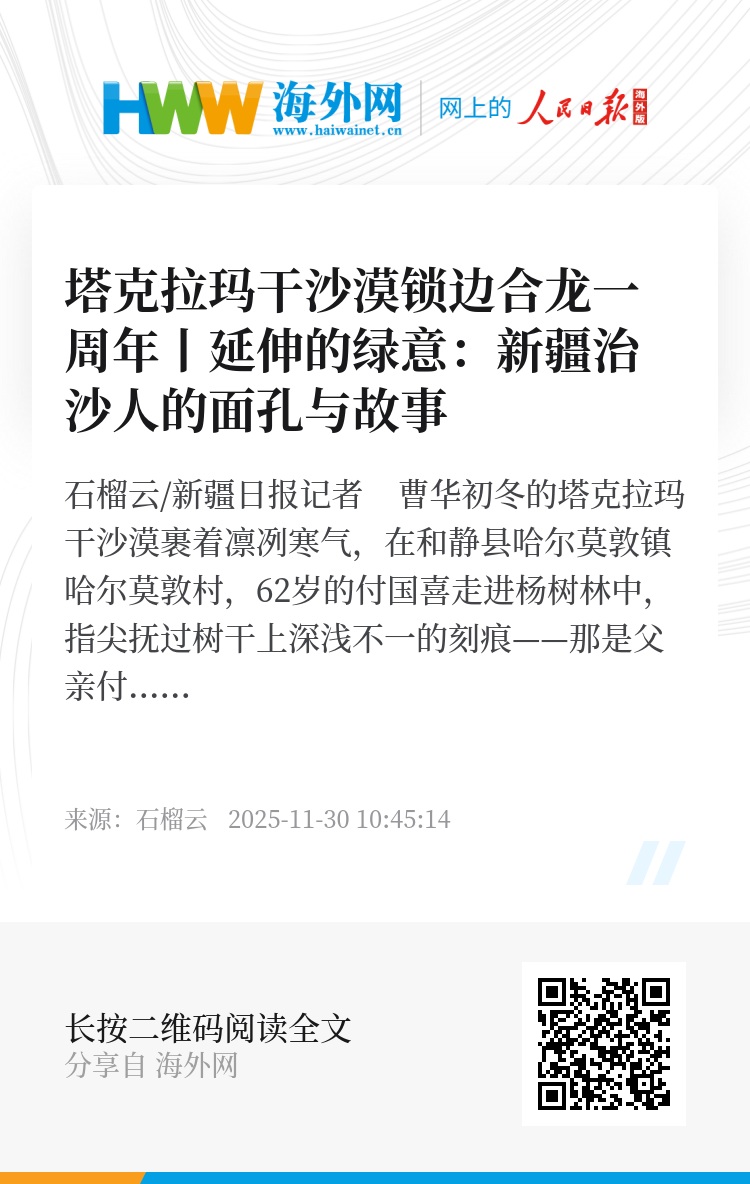 初冬的塔克拉玛干沙漠裹着凛冽寒气,在和静县哈尔莫敦镇哈尔莫敦村,62岁的付国喜走进杨树林中,指尖抚过树干上深浅不一的刻痕——那是父亲付志周生前记录树木生长的印记,也是一段治沙岁月的年轮。