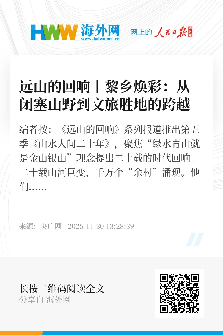 编者按:央广网《远山的回响》系列报道推出第五季《山水人间二十年》,聚焦“绿水青山就是金山银山”理念提出二十载的时代回响。二十载山河巨变,千万个“余村”涌现。他们是“两山”滋养的新生代,用AI技术嫁接生态农业,以创客思维激活田园梦想,让陈旧老屋变身“共益社区”……青春与青山双向奔赴,山水间的幸福画卷,如今正在变成现实。