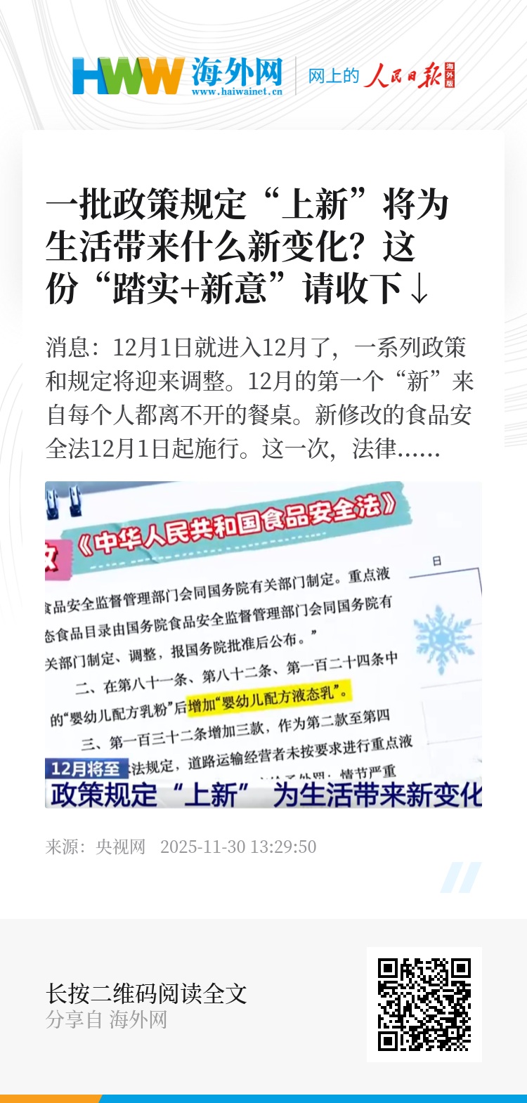 12月的第一个“新”来自每个人都离不开的餐桌。新修改的食品安全法12月1日起施行。这一次,法律对液态食品管控更严格了,对重点液态食品道路散装运输实行许可制度。让食用油、调味料这些家家都有的东西,从运输到上桌都能查得到链条。婴幼儿配方液态乳首次被纳入注册管理。从锅里的油到奶瓶里的奶,每一步都更透明。
