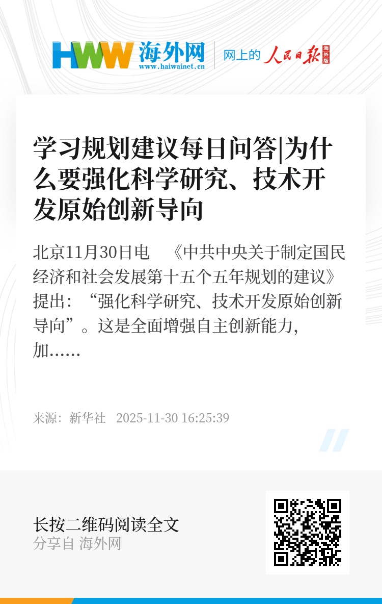 新华社北京11月30日电 《中共中央关于制定国民经济和社会发展第十五个五年规划的建议》提出:“强化科学研究、技术开发原始创新导向”。这是全面增强自主创新能力,加快推进高水平科技自立自强的重要举措。