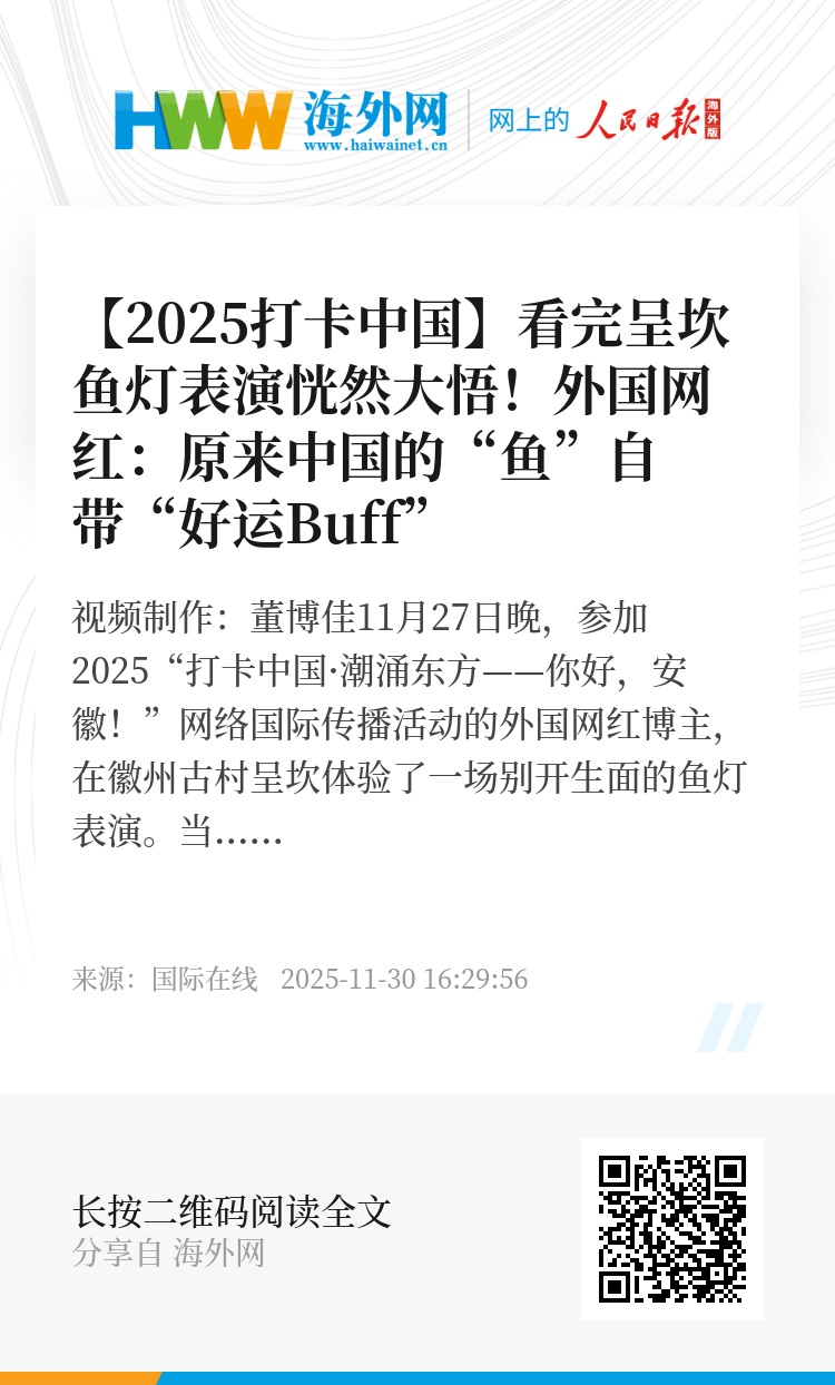 11月27日晚,参加2025“打卡中国·潮涌东方——你好,安徽!”网络国际传播活动的外国网红博主,在徽州古村呈坎体验了一场别开生面的鱼灯表演。当了解到“鱼”在中国文化中象征着好运、财富与幸福后,埃及网红博主兴奋地表示:“知道了它的寓意,我对这些鱼灯更加喜爱了!”