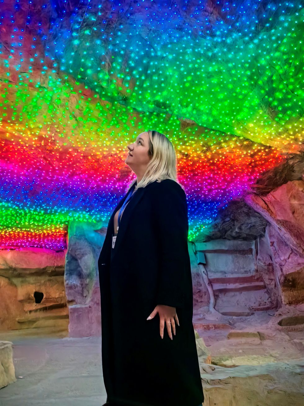 行程尾声,网红博主们来到花山世界・花山谜窟主题园区,解锁智慧旅游新体验。在35号窟,大家跟随以黄山松鼠奇石为原型的虚拟人物“花仔”开启解谜之旅,循着声光电科技营造的悬疑氛围,探寻八大未解猜想,还与NPC演员互动,在动态体验中感受古徽州人文故事。2号窟则通过投影视频、激光灯、雾森等现代设施,打造出“迷雾竹林”“时光隧道”等奇幻场景,裸眼 3D 光影与石窟地貌交织,仿佛穿梭时空。博主们循着游览路线缓缓前行,时而驻足端详岩壁上的凿痕,时而惊叹于光影变幻下的洞窟秘境,纷纷举起相机记录这自然造化与科技赋能的双重魅力。俄罗斯网红博主惊叹:“千年石窟在科技加持下既藏历史厚重,又具现代酷感,真是一个宝藏游览地!”