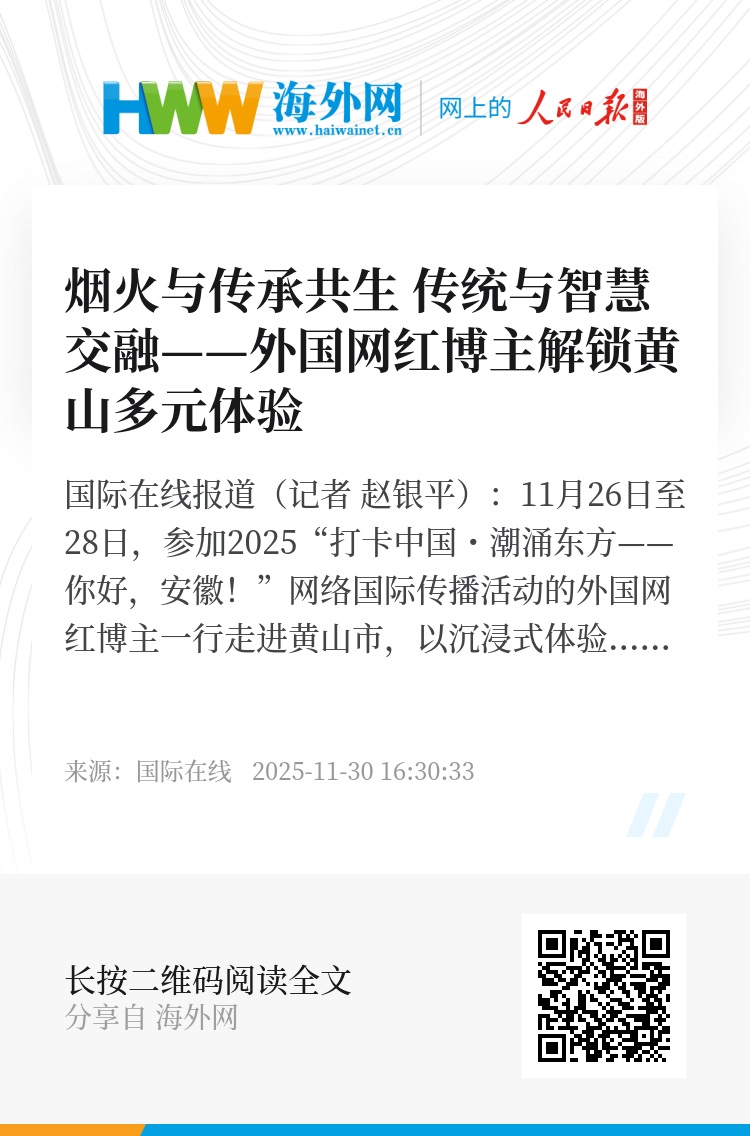 国际在线报道(记者 赵银平):11月26日至28日,参加2025“打卡中国・潮涌东方——你好,安徽!”网络国际传播活动的外国网红博主一行走进黄山市,以沉浸式体验为纽带,将民俗非遗的鲜活、山水生态的诗意与科技赋能的创新体验融为一体,在粉墙黛瓦与自然人文的交织中,解锁这片土地的多元魅力,读懂千年文化传承的当代生命力。