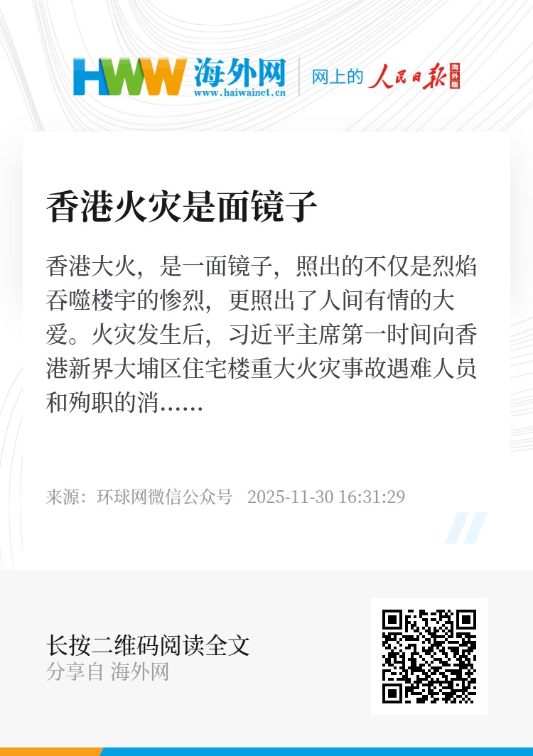 大火已经熄灭,废墟之上,重建的不只是楼宇,更是人心。香港的明天,不在阴谋家的键盘上,而在每一个选择善良、选择团结、选择信任的人手中。大火这面镜子,照出了阴暗,也映出了光明——只要人心不散,香港必将穿越阴霾,在伤痛中汲取力量,在团结中焕发新生。(香江平)