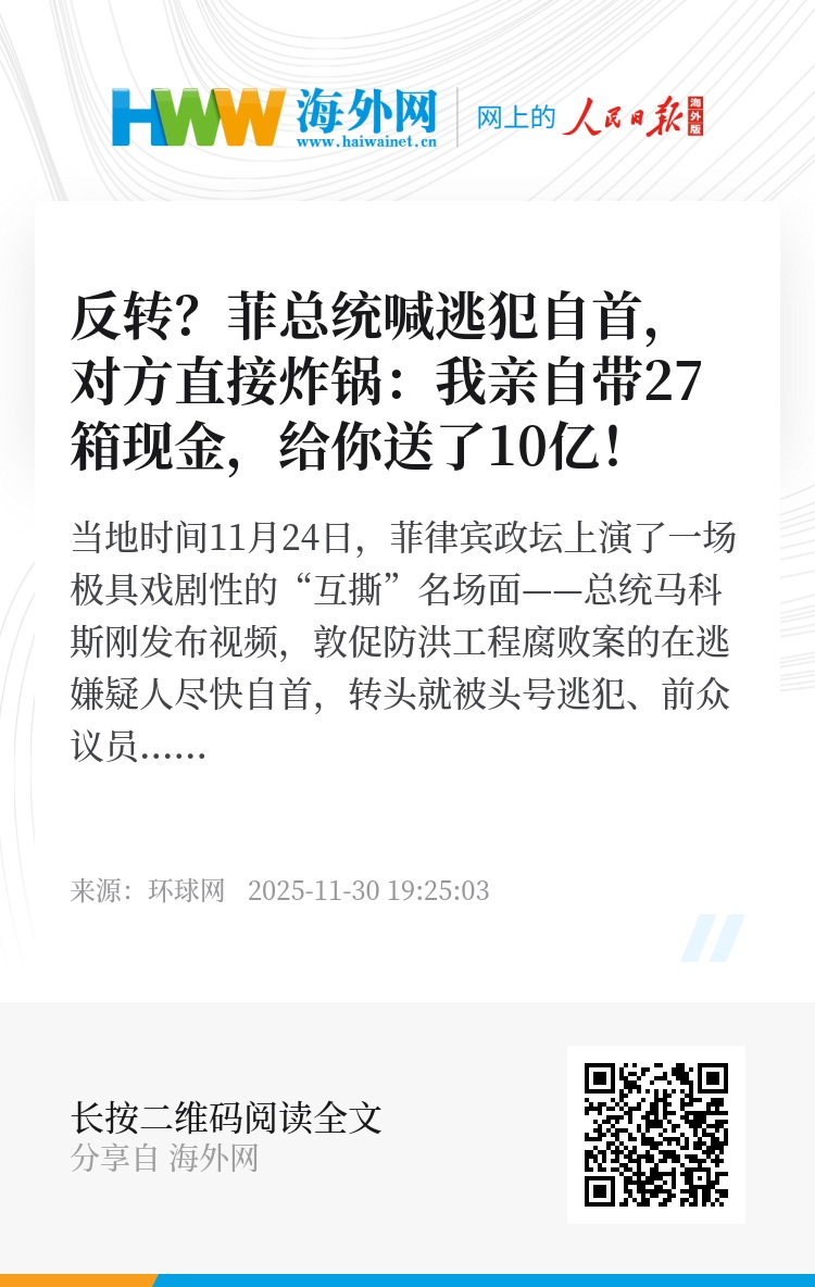 当地时间11月24日,菲律宾政坛上演了一场极具戏剧性的“互撕”名场面——总统马科斯刚发布视频,敦促防洪工程腐败案的在逃嫌疑人尽快自首,转头就被头号逃犯、前众议员扎尔迪·许反手“爆料锤脸”,直指马科斯本人就是这起百亿贪腐案的核心参与者。
