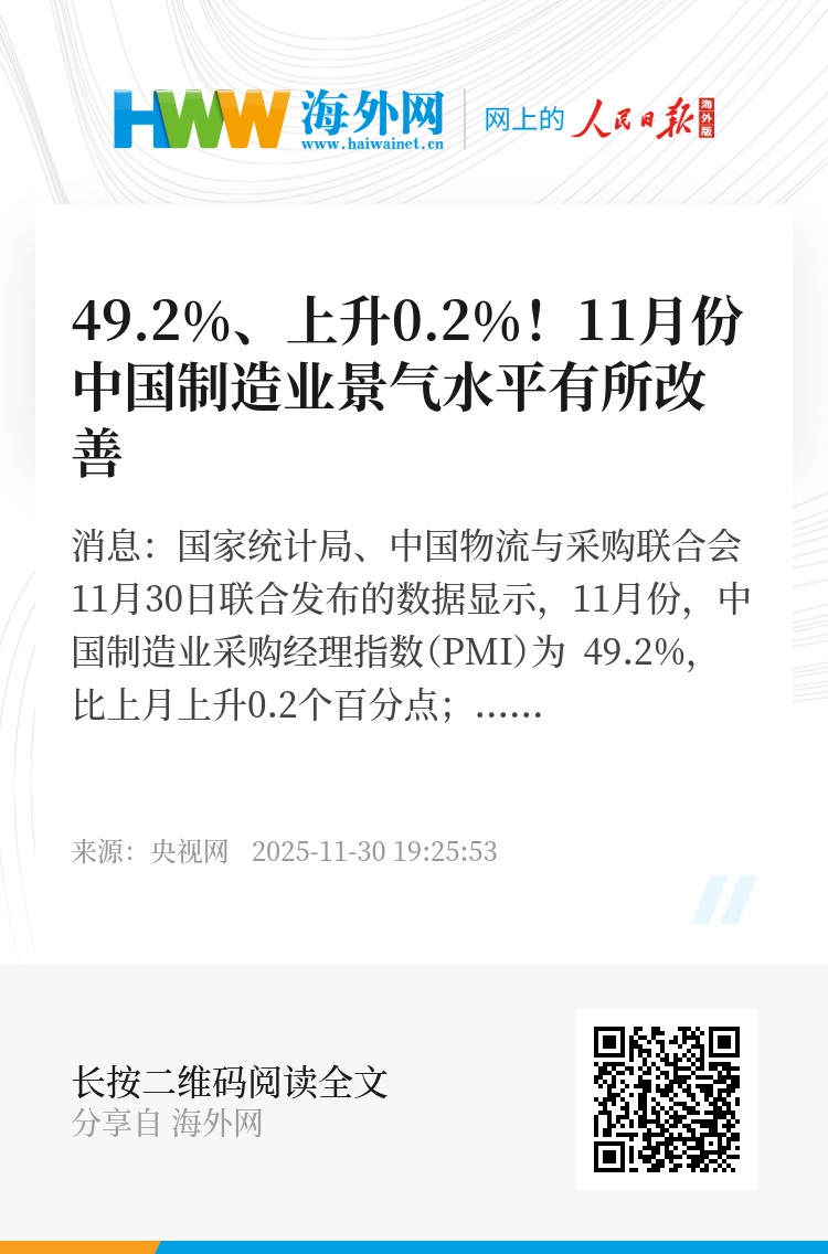 央视网消息:国家统计局、中国物流与采购联合会11月30日联合发布的数据显示,11月份,中国制造业采购经理指数(PMI)为 49.2%,比上月上升0.2个百分点;制造业景气水平有所改善。