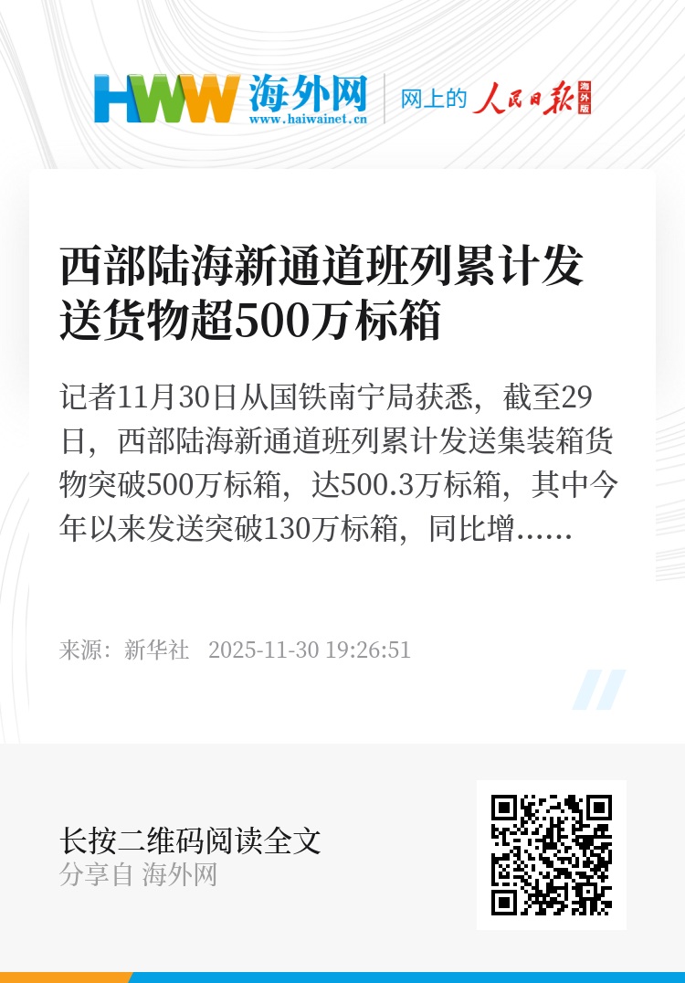 记者11月30日从国铁南宁局获悉,截至29日,西部陆海新通道班列累计发送集装箱货物突破500万标箱,达500.3万标箱,其中今年以来发送突破130万标箱,同比增长55.3%,保持强劲增长势头。