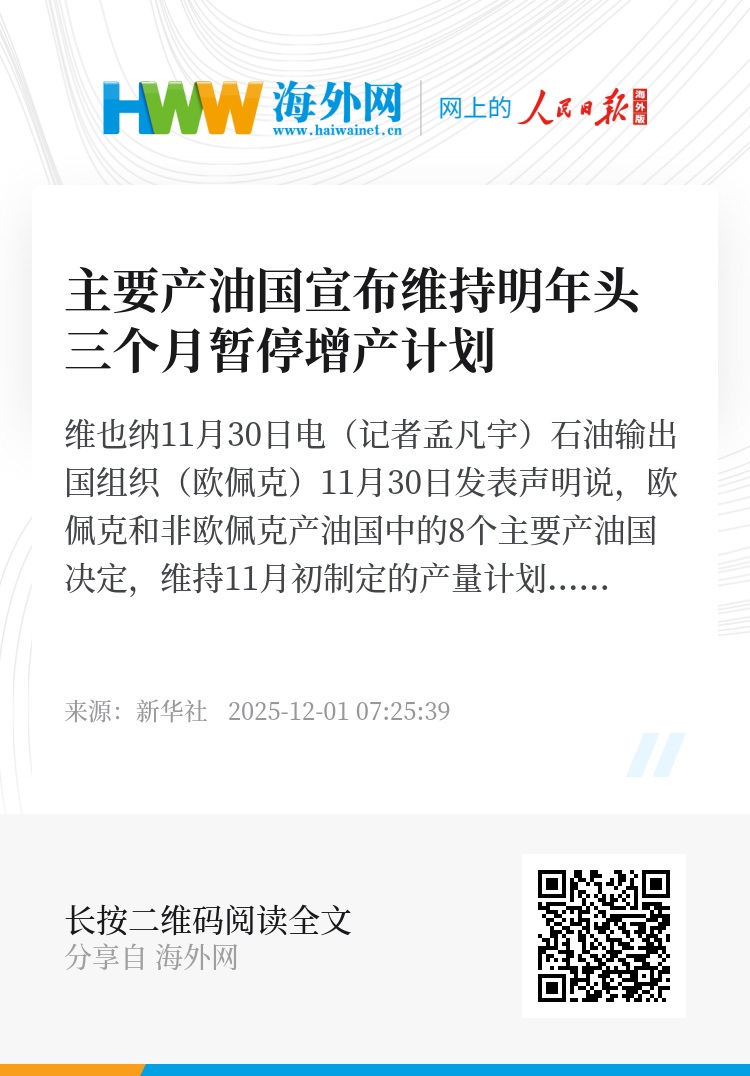 新华社维也纳11月30日电(记者孟凡宇)石油输出国组织(欧佩克)11月30日发表声明说,欧佩克和非欧佩克产油国中的8个主要产油国决定,维持11月初制定的产量计划,在2026年头三个月暂停增产。