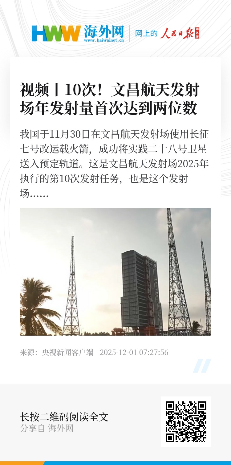 这是文昌航天发射场2025年执行的第10次发射任务,也是这个发射场的年发射量首次达到两位数。