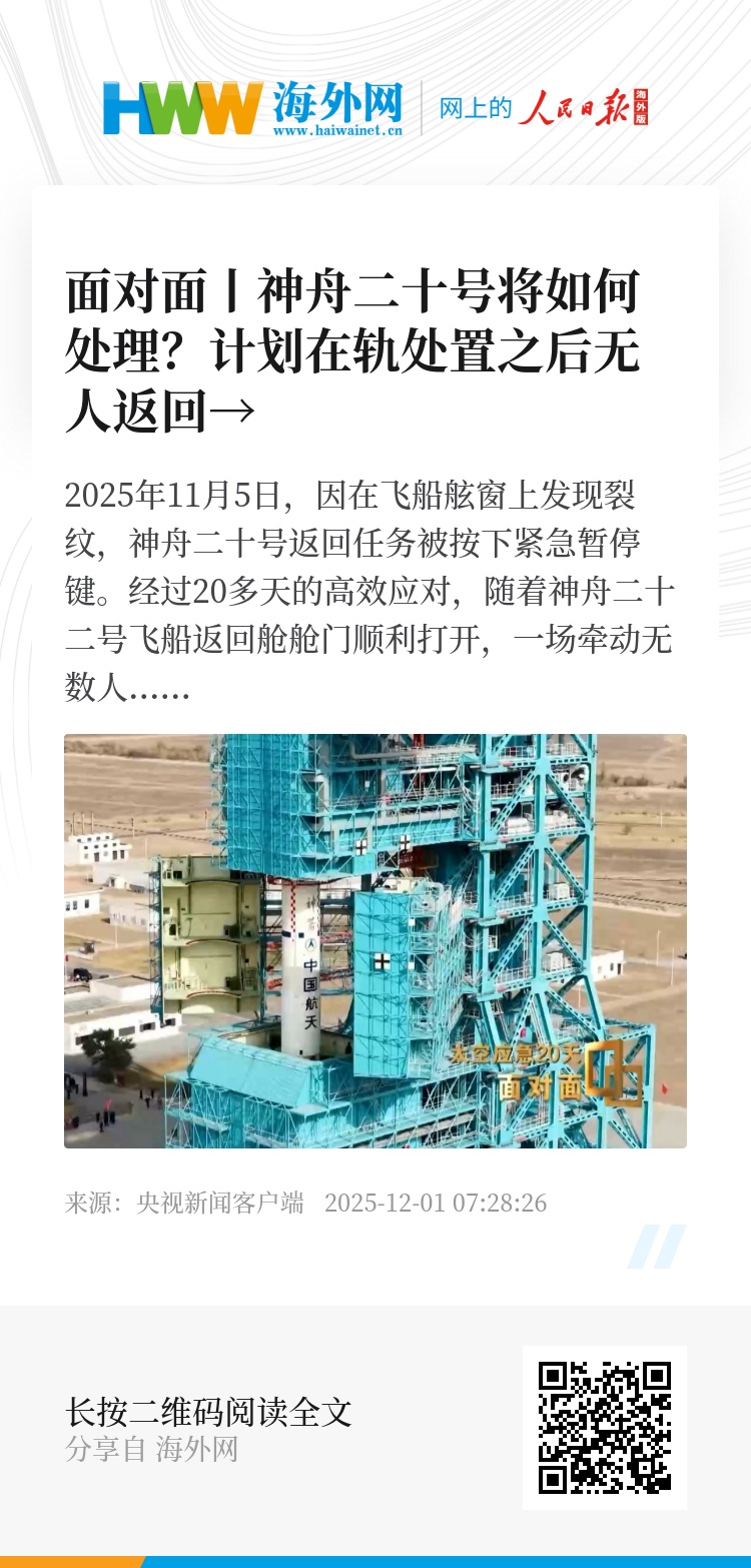 中国载人航天工程办公室主任助理 工程新闻发言人 季启明:对,在下一次航天员出舱的时候,可能会去进行这个工作。这次发射的神舟二十二号飞船上面,我们也上行了一个处置装置,到时候可能视情况请航天员对受损的舷窗进行防护。这项工作地面还在开展试验验证,但是神舟二十二号飞船的发射时机是不能错过的,所以我们把有关的一些工具已经上行上去了。最后神舟二十号会以无人的状态返回地球,返回的过程也会拿到最真实的试验数据,这个数据对后续相关工作也是非常宝贵、非常有意义的。
