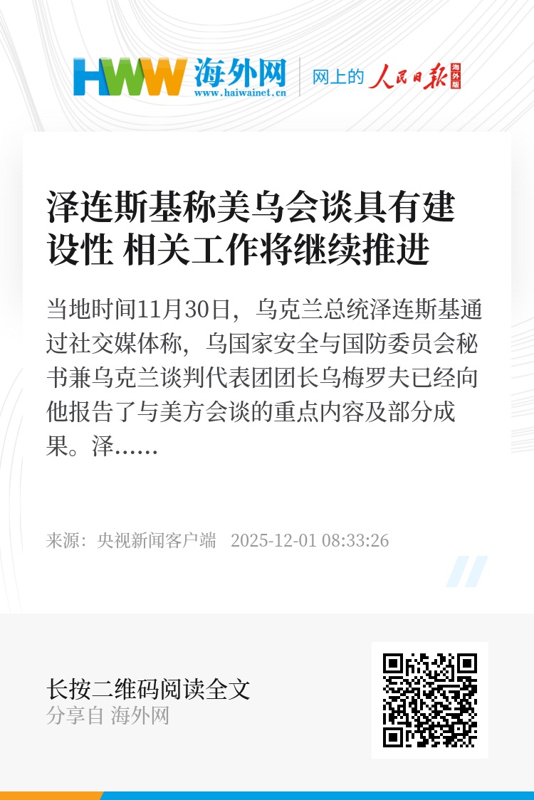 当地时间11月30日,乌克兰总统泽连斯基通过社交媒体称,乌国家安全与国防委员会秘书兼乌克兰谈判代表团团长乌梅罗夫已经向他报告了与美方会谈的重点内容及部分成果。