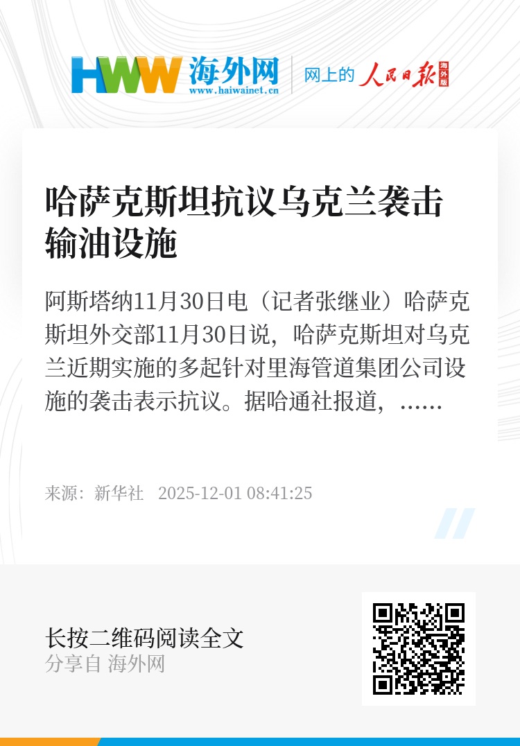 新华社阿斯塔纳11月30日电(记者张继业)哈萨克斯坦外交部11月30日说,哈萨克斯坦对乌克兰近期实施的多起针对里海管道集团公司设施的袭击表示抗议。