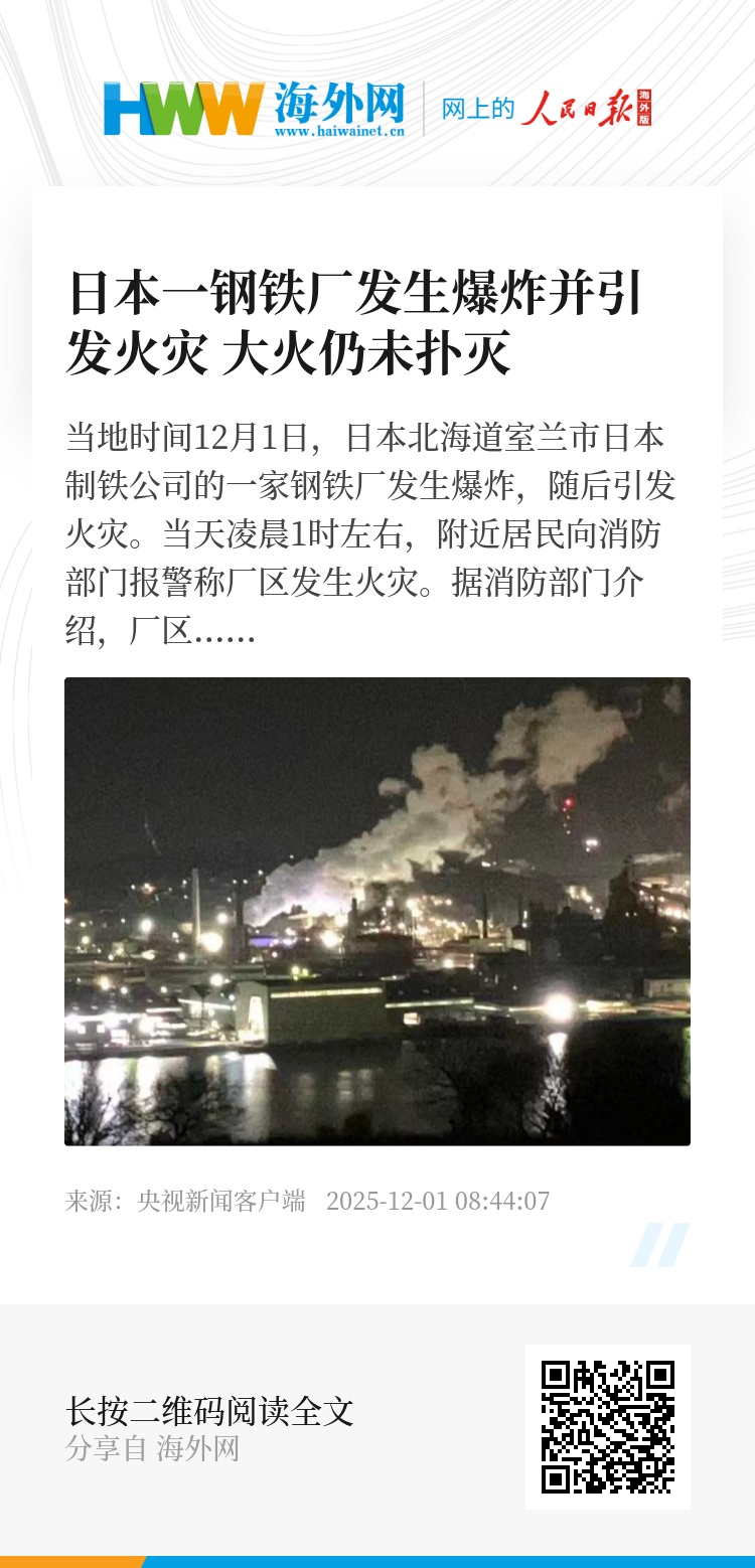 当地时间12月1日,日本北海道室兰市日本制铁公司的一家钢铁厂发生爆炸,随后引发火灾。