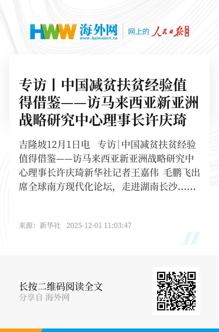 新华社吉隆坡12月1日电 专访|中国减贫扶贫经验值得借鉴——访马来西亚新亚洲战略研究中心理事长许庆琦