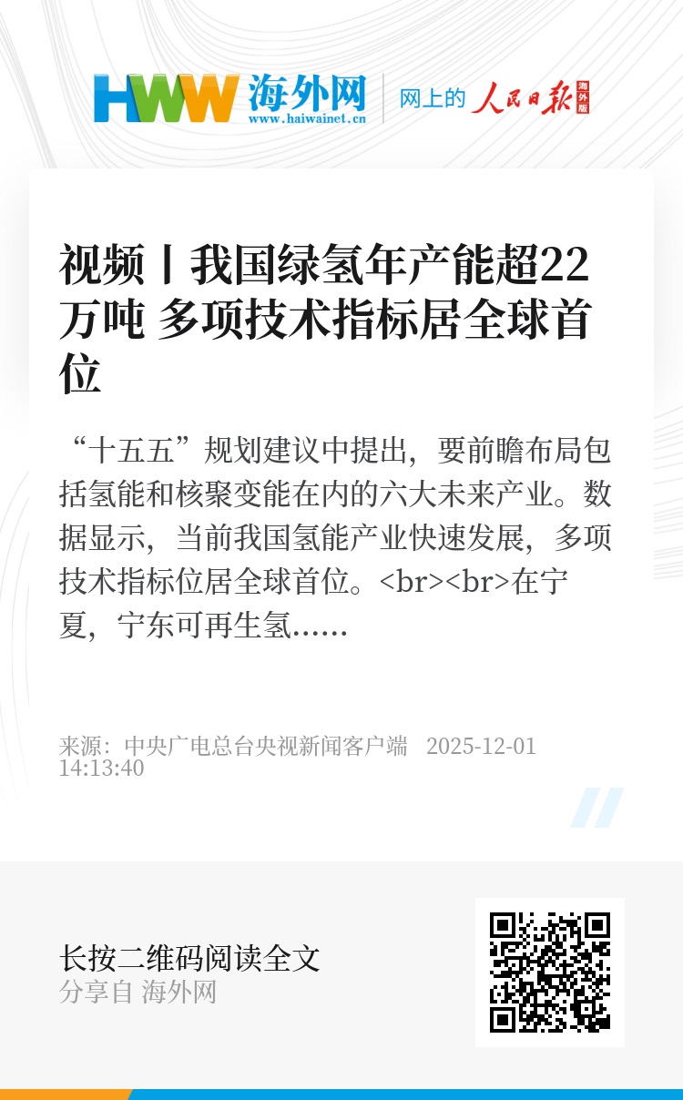 中国氢能联盟秘书长 万燕鸣:目前,我国的绿氢产能已经超过每年22万吨,占全球的50%以上;建成的加氢站已经超过540座,占全球的40%。