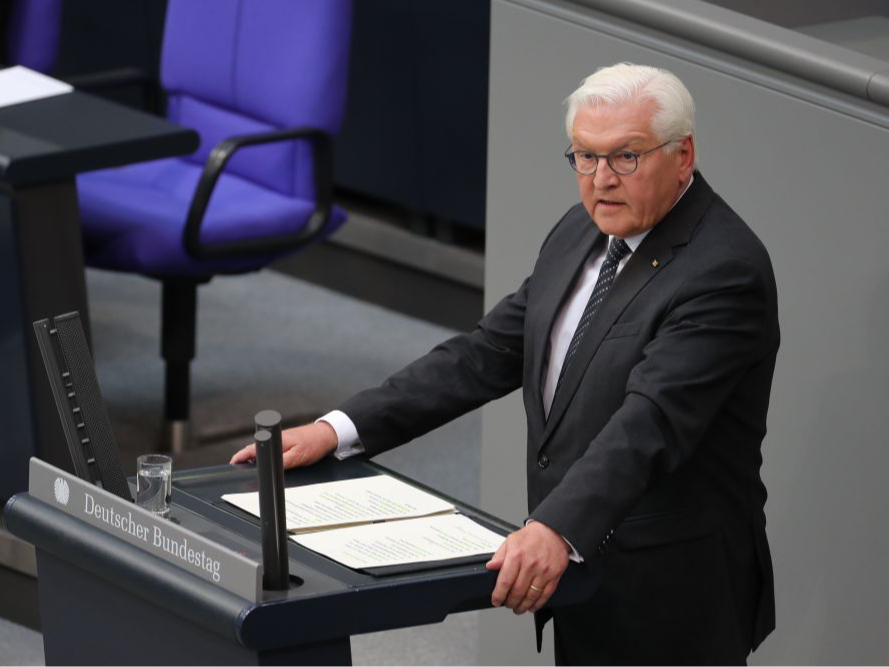 5月8日,德国总统施泰因迈尔在首都柏林国会大厦举行的第二次世界大战欧洲战场胜利80周年纪念活动上致辞。新华社记者杜哲宇摄