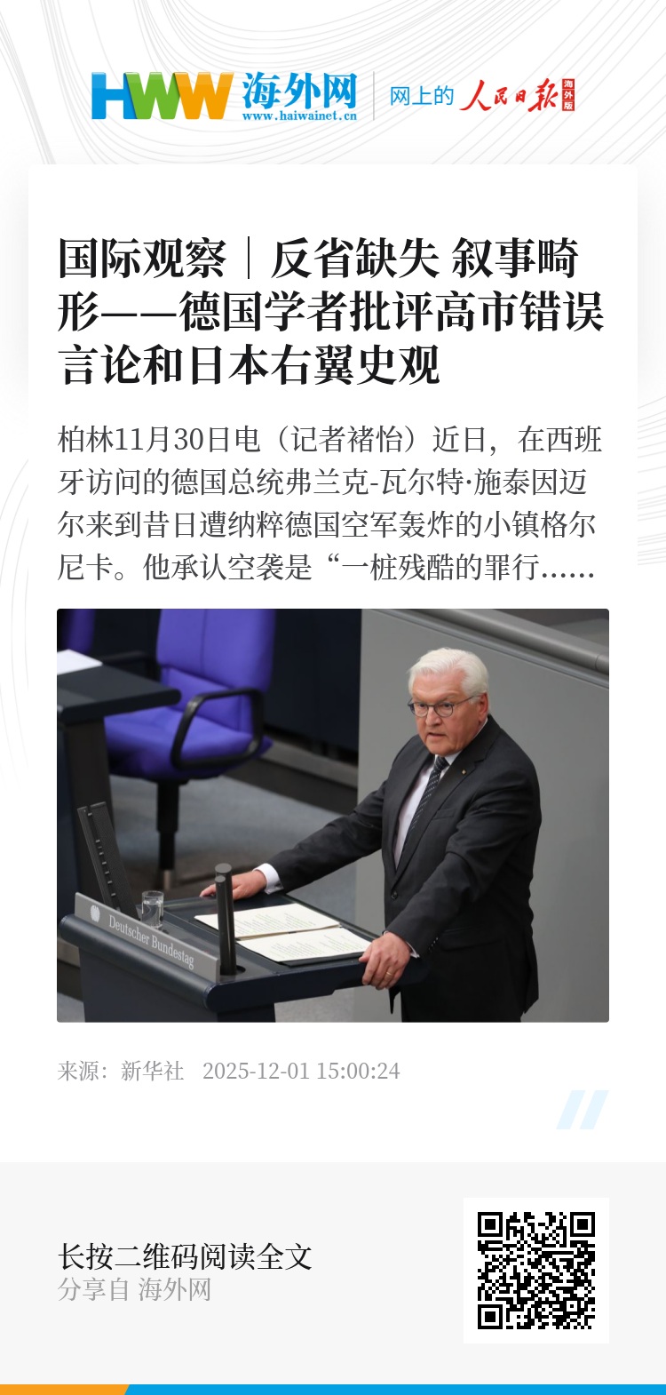 德国多家媒体近来发表评论或援引专家学者观点指出,高市发表的错误言论凸显日本政治右倾化加剧的趋势,给地区乃至世界的和平稳定带来严重威胁。