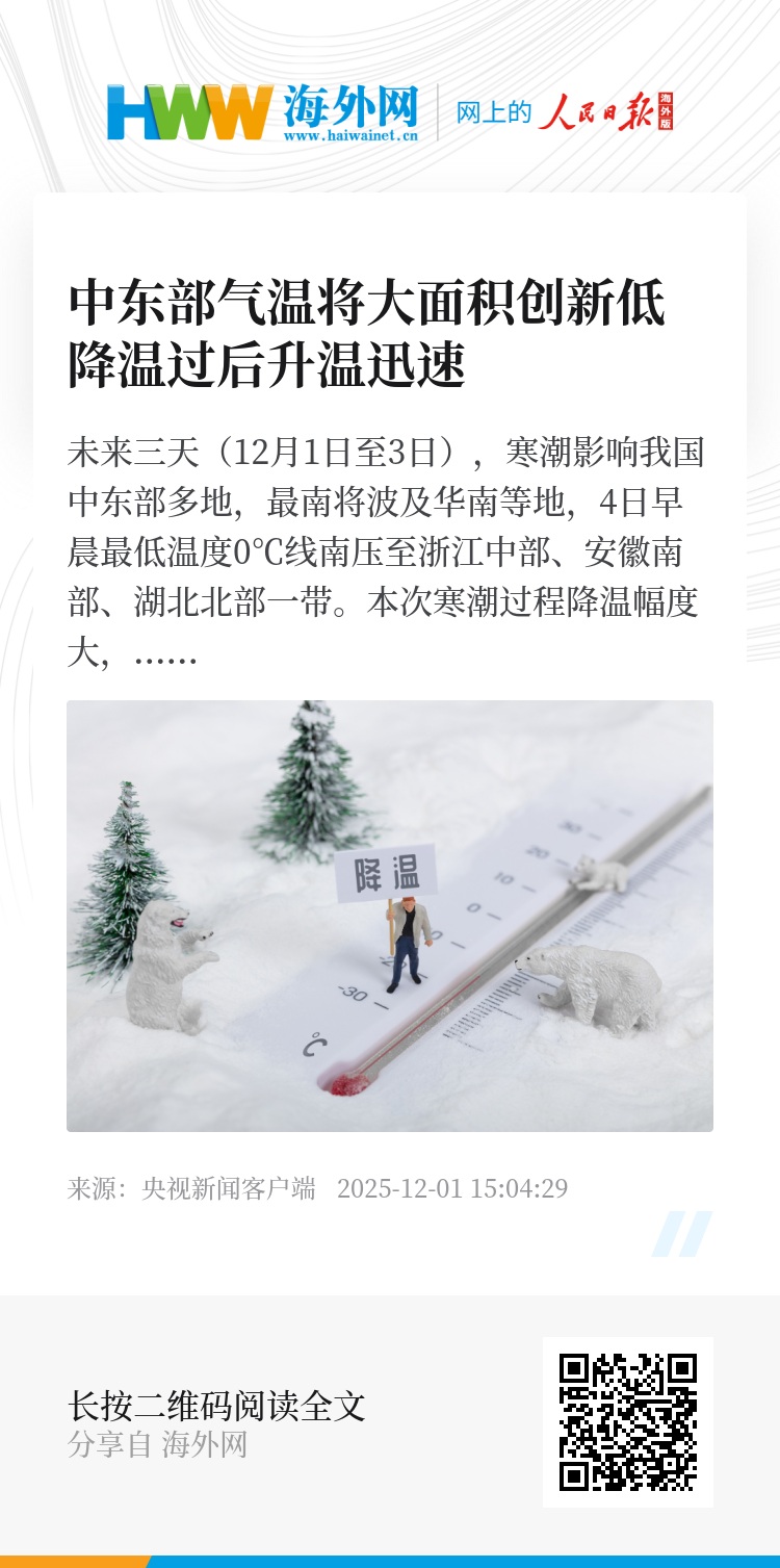未来三天(12月1日至3日),寒潮影响我国中东部多地,最南将波及华南等地,4日早晨最低温度0℃线南压至浙江中部、安徽南部、湖北北部一带。本次寒潮过程降温幅度大,多地降幅将超10℃,北方局地累计降幅可达17至18℃,江淮、黄淮、华北、东北等地气温将大面积创下半年新低。降温过后升温迅速,6日至7日中东部大部气温转为偏高,冷暖转换频繁,公众请适时调整着装,谨防感冒。