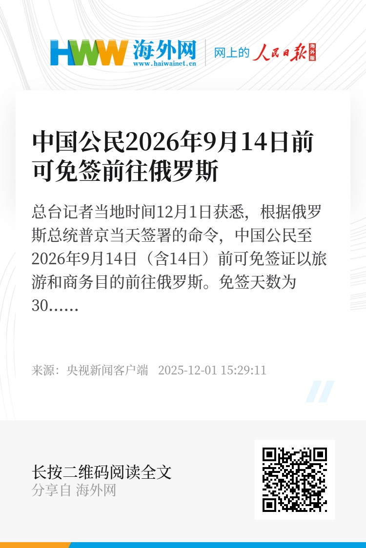 总台记者当地时间12月1日获悉,根据俄罗斯总统普京当天签署的命令,中国公民至2026年9月14日(含14日)前可免签证以旅游和商务目的前往俄罗斯。免签天数为30天。(总台记者 王德禄)