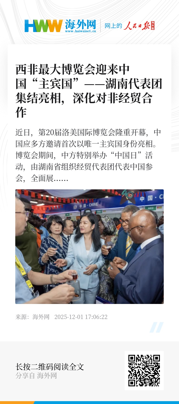 近日,第20届洛美国际博览会隆重开幕,中国应多方邀请首次以唯一主宾国身份亮相。博览会期间,中方特别举办“中国日”活动,由湖南省组织经贸代表团代表中国参会,全面展现中国与非洲,特别是与多哥的经贸合作成果与未来机遇。