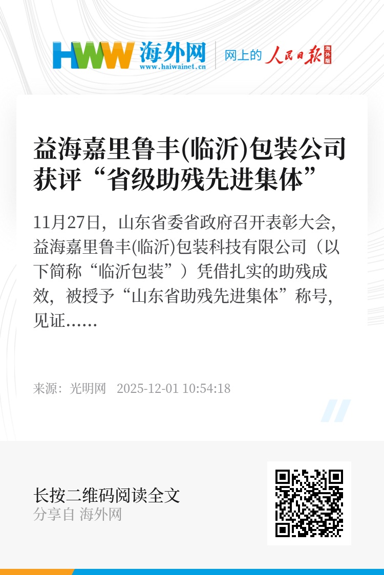 11月27日,山东省委省政府召开表彰大会,益海嘉里鲁丰(临沂)包装科技有限公司(以下简称“临沂包装”)凭借扎实的助残成效,被授予“山东省助残先进集体”称号,见证其十年深耕助残事业的责任担当。