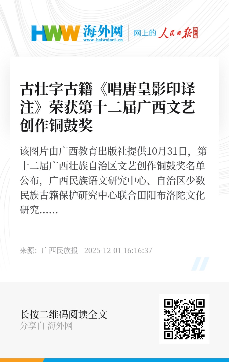 10月31日,第十二届广西壮族自治区文艺创作铜鼓奖名单公布,广西民族语文研究中心、自治区少数民族古籍保护研究中心联合田阳布洛陀文化研究会编写,黄明标主编的古壮字古籍整理成果《唱唐皇影印译注》,荣获第十二届广西壮族自治区文艺创作铜鼓奖(文学类民间文学)。
