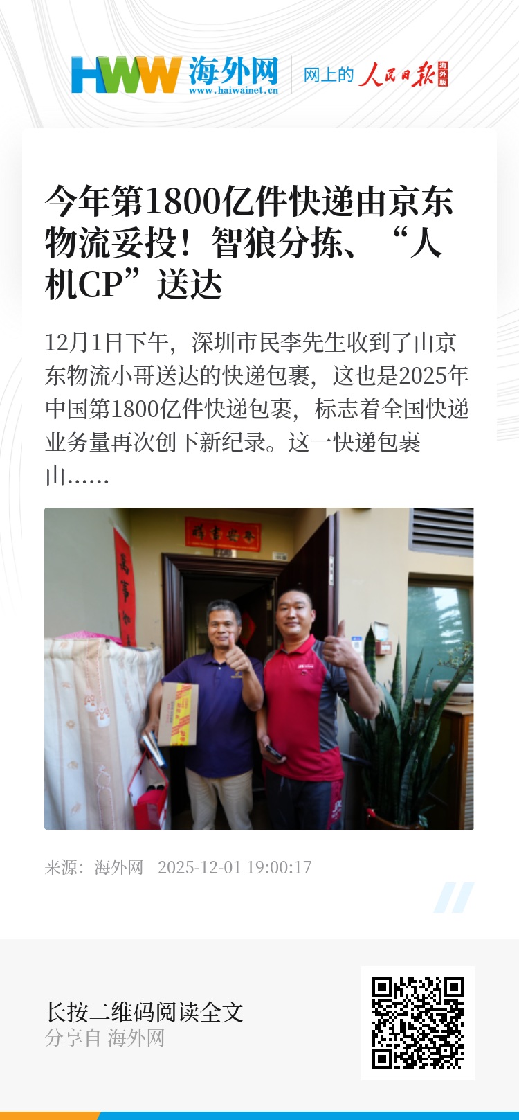 12月1日下午,深圳市民李先生收到了由京东物流小哥送达的快递包裹,这也是2025年中国第1800亿件快递包裹,标志着全国快递业务量再次创下新纪录。