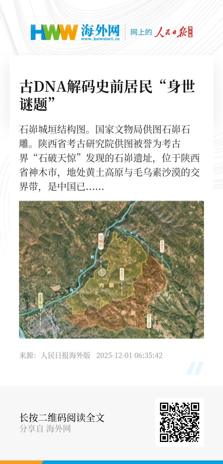 就在11月27日,研究成果《石峁古城古DNA揭秘新石器时代中国地区亲缘关系习俗》在《自然》(Nature)杂志上线发表,揭开了石峁人群的神秘面纱。专家评价该研究“在东亚地区开创了运用古DNA方法揭示史前社会阶级分化与人祭现象的研究先河”。