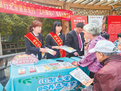 重阳节前后,中国工商银行北京望京支行工作人员走进社区,开展敬老主题活动。图为工作人员在介绍金融消费者权益保护相关知识。