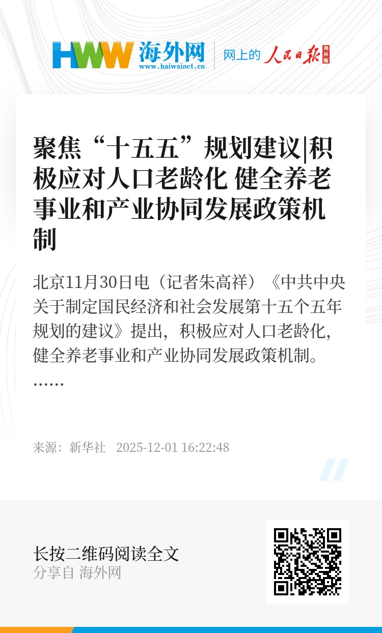 新华社北京11月30日电(记者朱高祥)《中共中央关于制定国民经济和社会发展第十五个五年规划的建议》提出,积极应对人口老龄化,健全养老事业和产业协同发展政策机制。