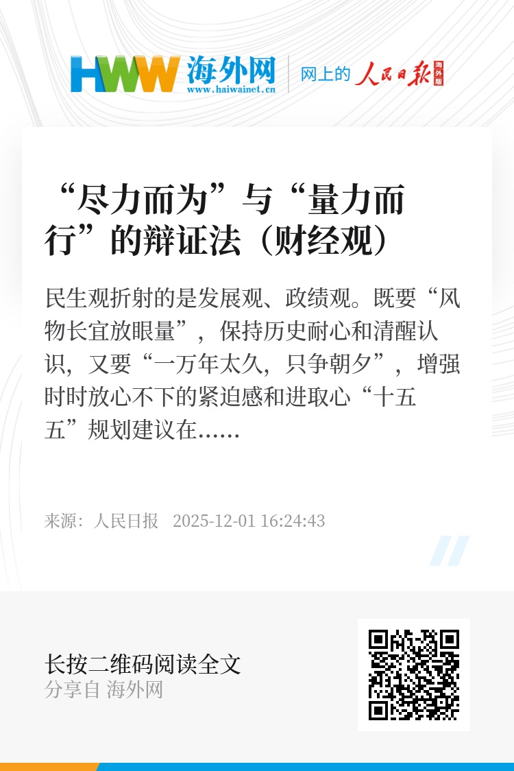 “尽力而为”与“量力而行”蕴含着深刻的辩证法,民生观折射的是发展观、政绩观。“保障和改善民生没有终点,只有连续不断的新起点”,既要“风物长宜放眼量”,保持历史耐心和清醒认识,又要“一万年太久,只争朝夕”,增强时时放心不下的紧迫感和进取心,一锤接着一锤敲,一张蓝图绘到底,把人民对美好生活的向往变成现实。(邱超奕)
